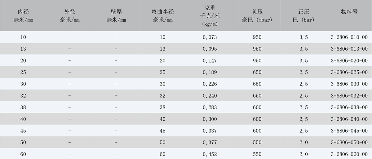 基于不同的安裝和操作環境,壓強指數可能會與表格中標注的有所不同。 若有所疑慮,請描述您想應用在什么工況,我 們很樂意為您提供建議。我們可以依據用戶的要求提供不同尺寸、顏色和誤差的軟管。技術參數 (20°C): 01/2020.