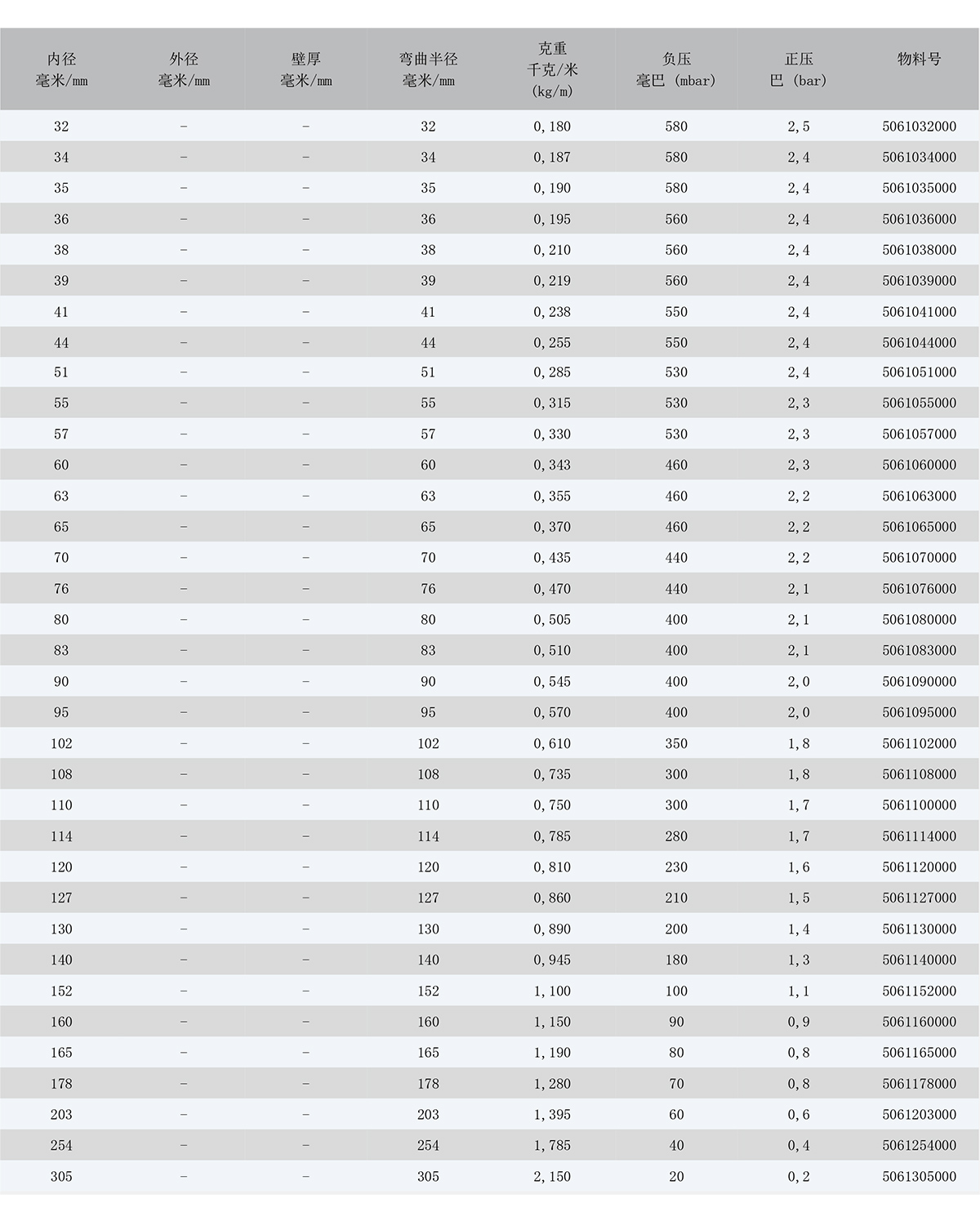 基于不同的安裝和操作環境,壓強指數可能會與表格中標注的有所不同。 若有所疑慮,請描述您想應用在什么工況,我 們很樂意為您提供建議。我們可以依據用戶的要求提供不同尺寸、顏色和誤差的軟管。技術參數 (20°C):01/2020.