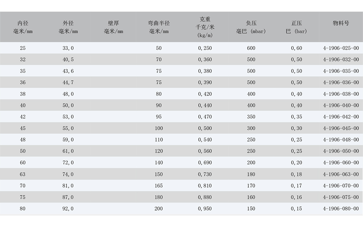 基于不同的安裝和操作環境,壓強指數可能會與表格中標注的有所不同。 若有所疑慮,請描述您想應用在什么工況,我 們很樂意為您提供建議。我們可以依據用戶的要求提供不同尺寸、顏色和誤差的軟管。技術參數 (20°C):01/2020.