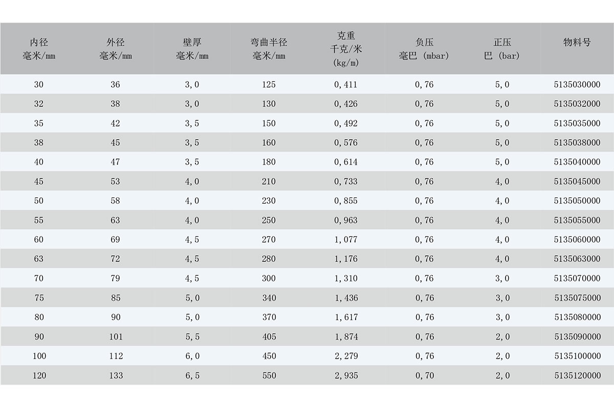 基于不同的安裝和操作環境,壓強指數可能會與表格中標注的有所不同。 若有所疑慮,請描述您想應用在什么工況,我 們很樂意為您提供建議。我們可以依據用戶的要求提供不同尺寸、顏色和誤差的軟管。技術參數 (20°C): 01/2020.