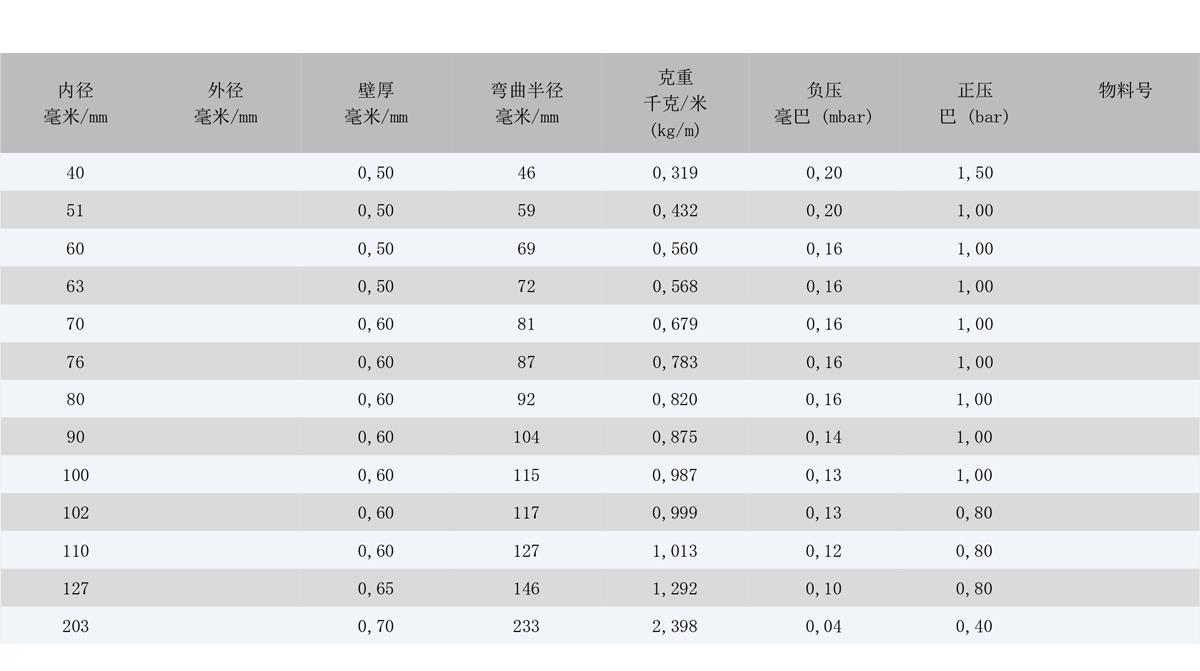 基于不同的安裝和操作環境,壓強指數可能會與表格中標注的有所不同。 若有所疑慮,請描述您想應用在什么工況,我 們很樂意為您提供建議。我們可以依據用戶的要求提供不同尺寸、顏色和誤差的軟管。技術參數 (20°C): 01/2020.