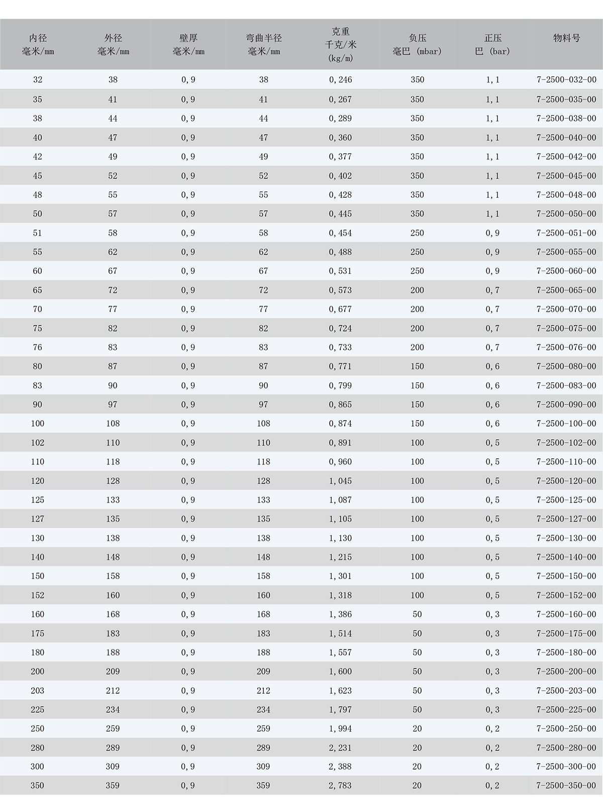 基于不同的安裝和操作環境,壓強指數可能會與表格中標注的有所不同。 若有所疑慮,請描述您想應用在什么工況,我 們很樂意為您提供建議。我們可以依據用戶的要求提供不同尺寸、顏色和誤差的軟管。技術參數 (20°C): 01/2020.