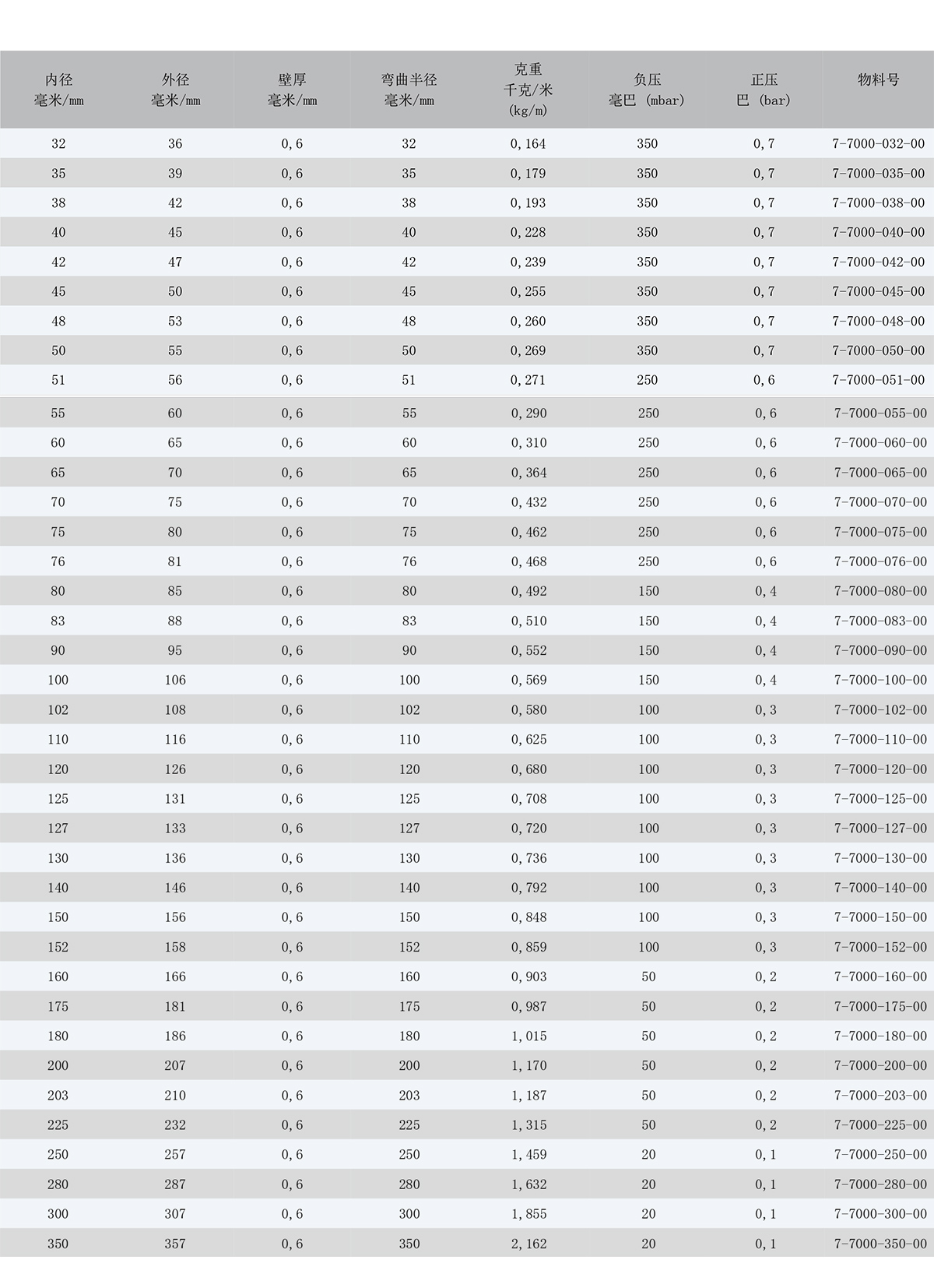 基于不同的安裝和操作環(huán)境,壓強(qiáng)指數(shù)可能會(huì)與表格中標(biāo)注的有所不同。 若有所疑慮,請(qǐng)描述您想應(yīng)用在什么工況,我 們很樂意為您提供建議。我們可以依據(jù)用戶的要求提供不同尺寸、顏色和誤差的軟管。技術(shù)參數(shù) (20°C): 01/2020.