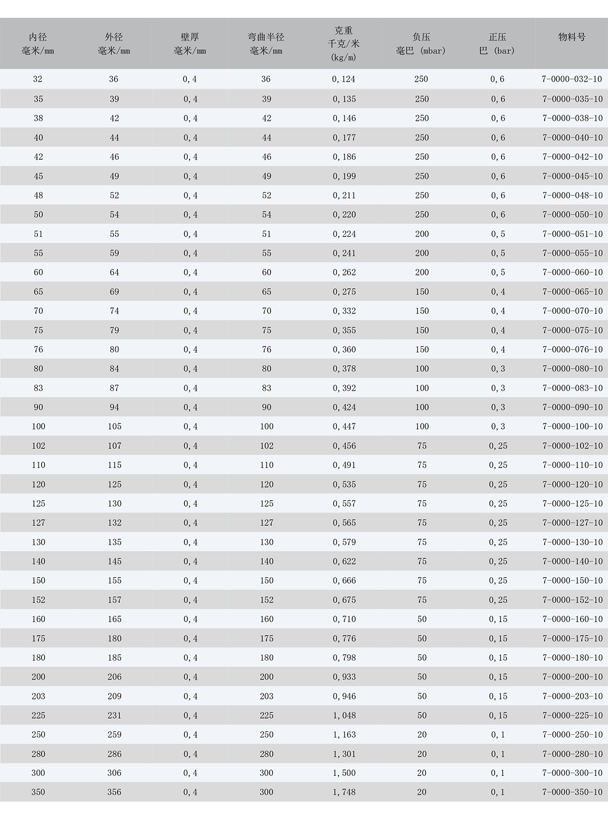 基于不同的安裝和操作環(huán)境,壓強指數(shù)可能會與表格中標(biāo)注的有所不同。 若有所疑慮,請描述您想應(yīng)用在什么工況,我 們很樂意為您提供建議。我們可以依據(jù)用戶的要求提供不同尺寸、顏色和誤差的軟管。技術(shù)參數(shù) (20°C): 01/2020.