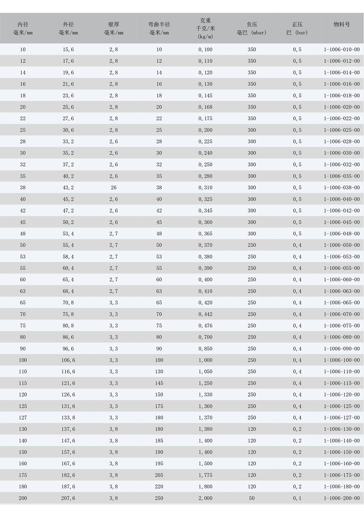 基于不同的安裝和操作環境,壓強指數可能會與表格中標注的有所不同。 若有所疑慮,請描述您想應用在什么工況,我 們很樂意為您提供建議。我們可以依據用戶的要求提供不同尺寸、顏色和誤差的軟管。技術參數 (20°C):01/2020.