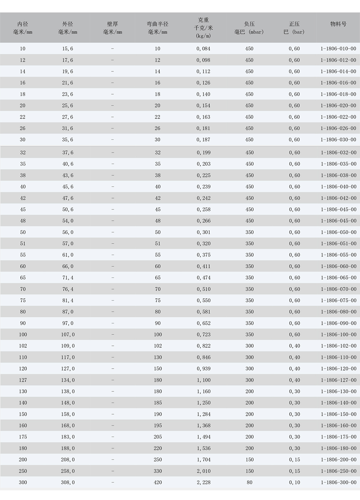 基于不同的安裝和操作環境,壓強指數可能會與表格中標注的有所不同。 若有所疑慮,請描述您想應用在什么工況,我 們很樂意為您提供建議。我們可以依據用戶的要求提供不同尺寸、顏色和誤差的軟管。技術參數 (20°C):01/2020.