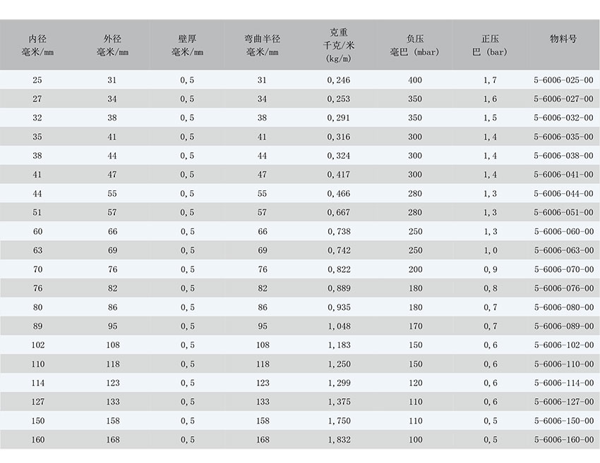基于不同的安裝和操作環境,壓強指數可能會與表格中標注的有所不同。 若有所疑慮,請描述您想應用在什么工況,我 們很樂意為您提供建議。我們可以依據用戶的要求提供不同尺寸、顏色和誤差的軟管。技術參數 (20°C): 01/2020.