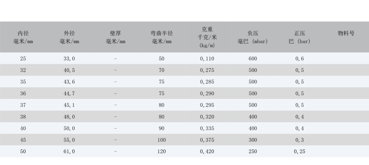 基于不同的安裝和操作環境,壓強指數可能會與表格中標注的有所不同。 若有所疑慮,請描述您想應用在什么工況,我 們很樂意為您提供建議。我們可以依據用戶的要求提供不同尺寸、顏色和誤差的軟管。技術參數 (20°C): 01/2020.