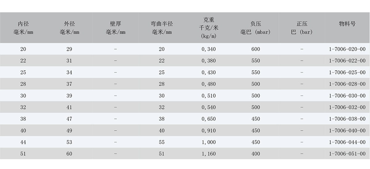 基于不同的安裝和操作環境,壓強指數可能會與表格中標注的有所不同。 若有所疑慮,請描述您想應用在什么工況,我 們很樂意為您提供建議。我們可以依據用戶的要求提供不同尺寸、顏色和誤差的軟管。技術參數 (20°C):01/2020.