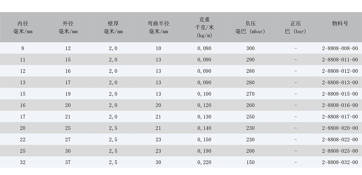 基于不同的安裝和操作環(huán)境,壓強(qiáng)指數(shù)可能會與表格中標(biāo)注的有所不同。 若有所疑慮,請描述您想應(yīng)用在什么工況,我 們很樂意為您提供建議。我們可以依據(jù)用戶的要求提供不同尺寸、顏色和誤差的軟管。技術(shù)參數(shù) (20°C):01/2020.