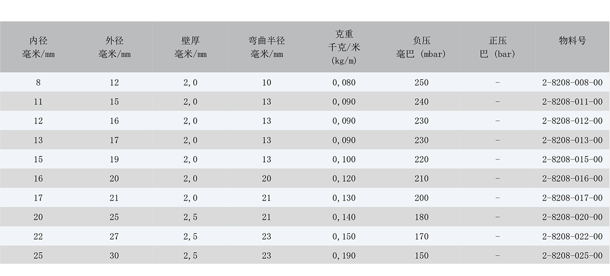 基于不同的安裝和操作環(huán)境,壓強(qiáng)指數(shù)可能會與表格中標(biāo)注的有所不同。 若有所疑慮,請描述您想應(yīng)用在什么工況,我 們很樂意為您提供建議。我們可以依據(jù)用戶的要求提供不同尺寸、顏色和誤差的軟管。技術(shù)參數(shù) (20°C):01/2020.