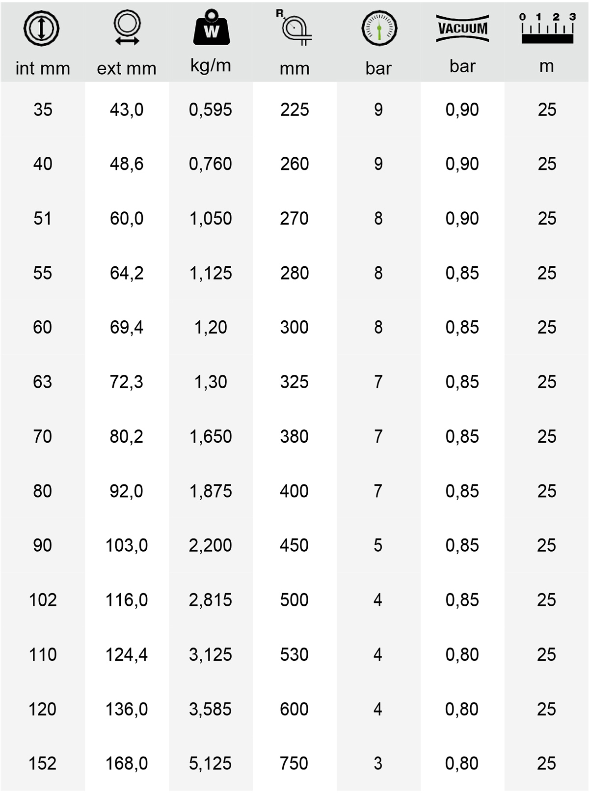 基于不同的安裝和操作環境,壓強指數可能會與表格中標注的有所不同。 若有所疑慮,請描述您想應用在什么工況,我 們很樂意為您提供建議。我們可以依據用戶的要求提供不同尺寸、顏色和誤差的軟管。技術參數 (20°C):01/2020.